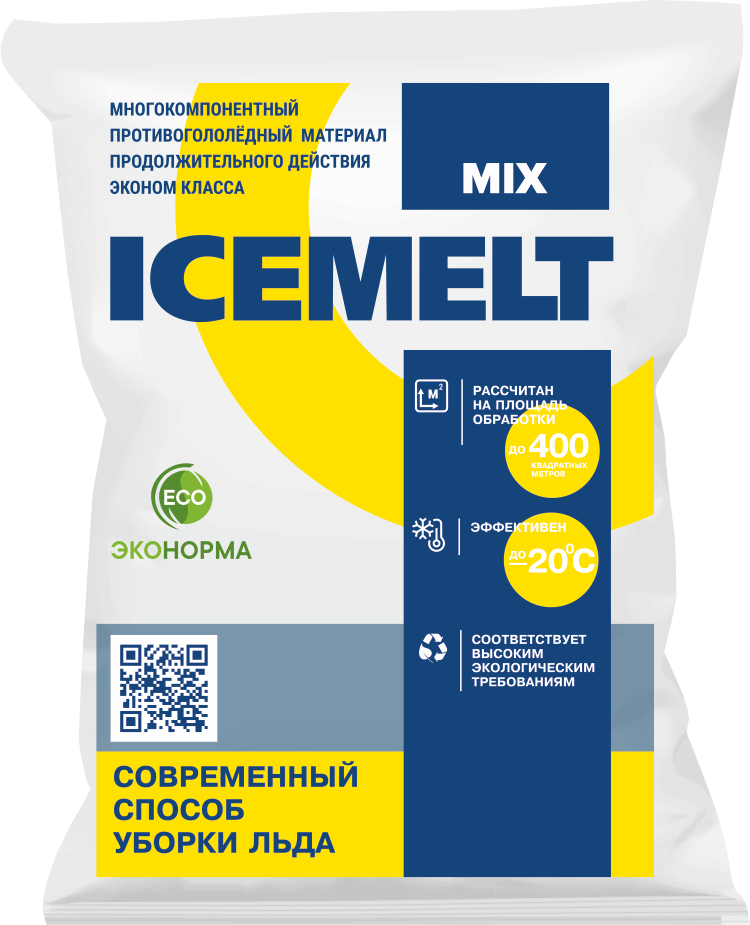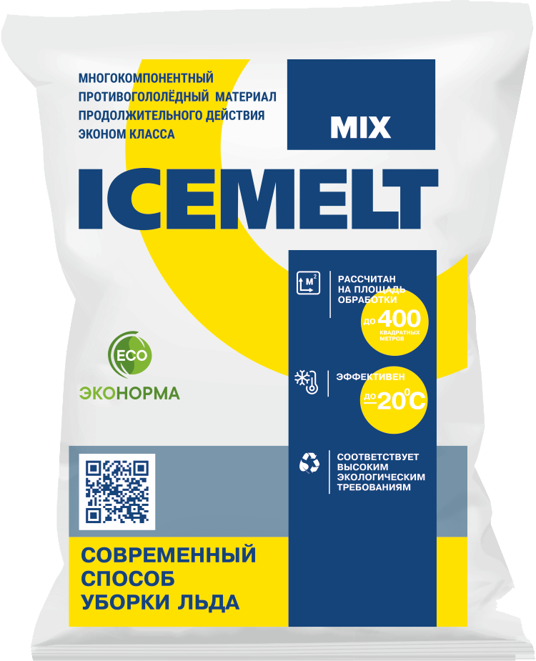 ЭФФЕКТИВНЫЙ ПРОТИВОГОЛОЛЕДНЫЙ МАТЕРИАЛ ICEMELT MIX ПРЕВОСХОДНО СПРАВЛЯЕТСЯ С ПРЕДУПРЕЖДЕНИЕМ ОБРАЗОВАНИЯ ГОЛОЛЕДА, ОБЕСПЕЧИВАЕТ НАИБОЛЕЕ ДЛИТЕЛЬНЫЙ ЭФФЕКТ ТАЯНИЯ ПРИ ТЕМПЕРАТУРЕ ДО -20°С ЗА СЧЕТ СБАЛАНСИРОВАННОГО КОМБИНИРОВАНИЯ ДВУХ ПРОТИВОГОЛОЛЕДНЫХ КОМПОНЕНТОВ.